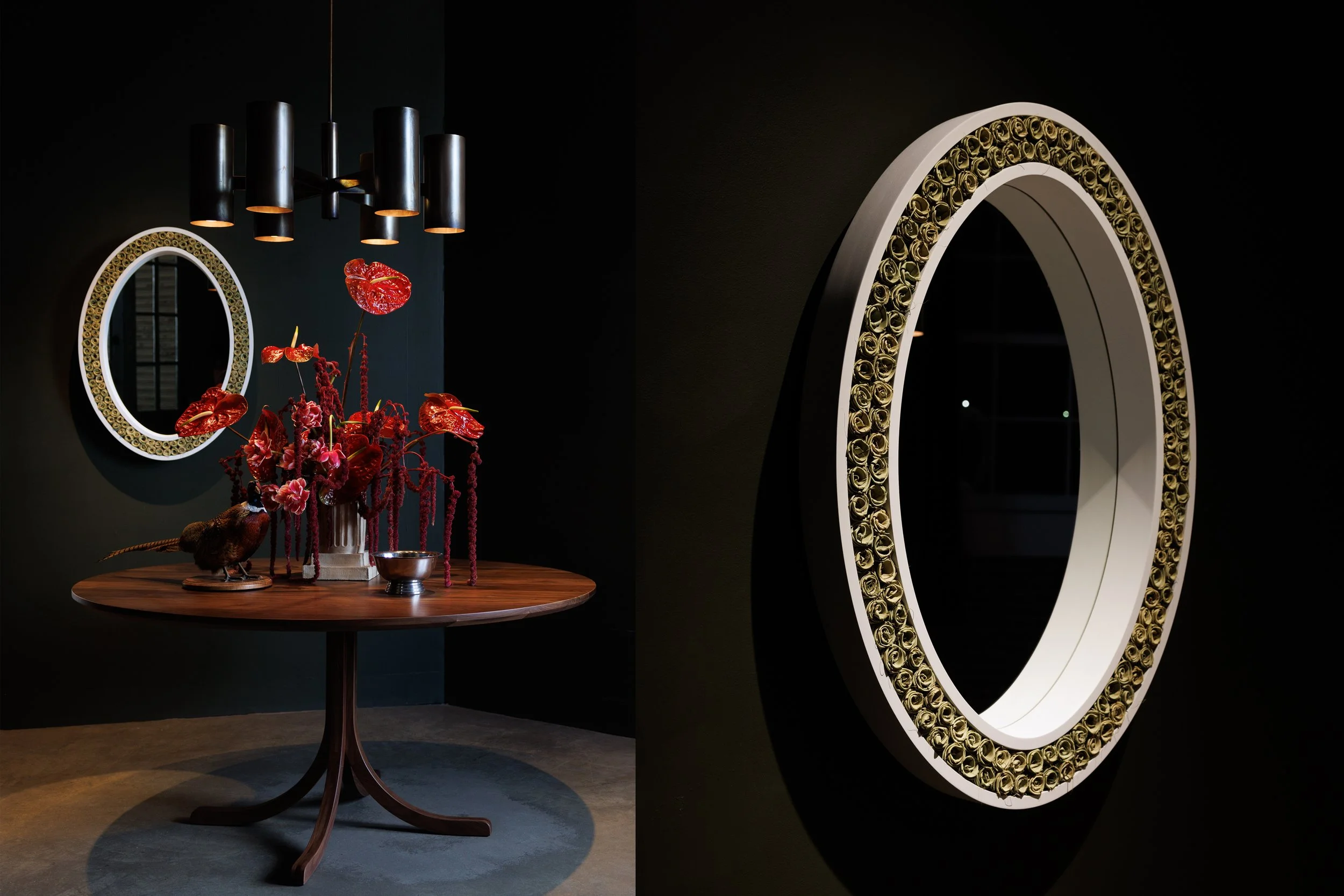 Navy Yard Shop 5 artists and craftsman come together for an interior design vignette presented at Noble Studio for Charleston X Design Sat. March 14, 2026. Palmetto Rose Mirror by Fletcher Williams III, Table by Benjamin Paul Studios, Light Fixture by Robert Long Lighting, Floral Arrangement and Vessel by Studio Sontosis, and Taxidermy by Sisal Creative.
