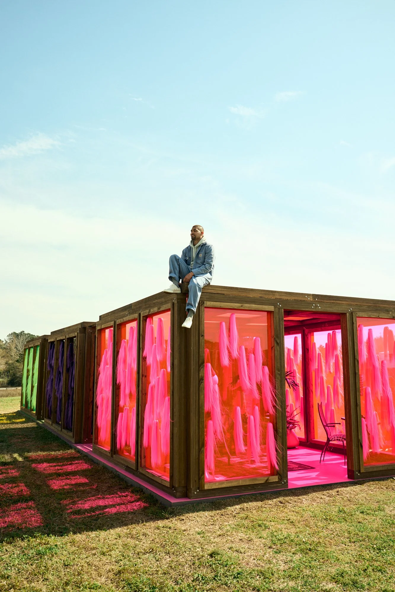 Though he spent formative years in New York, Williams’s work is rooted in Charleston and the Lowcountry. He uses both everyday and culturally specific materials—such as rusted tin, wood, sweetgrass, palmetto fronds, and fencing—alongside industrial materials like steel, plexiglass, LED lighting, and sound.