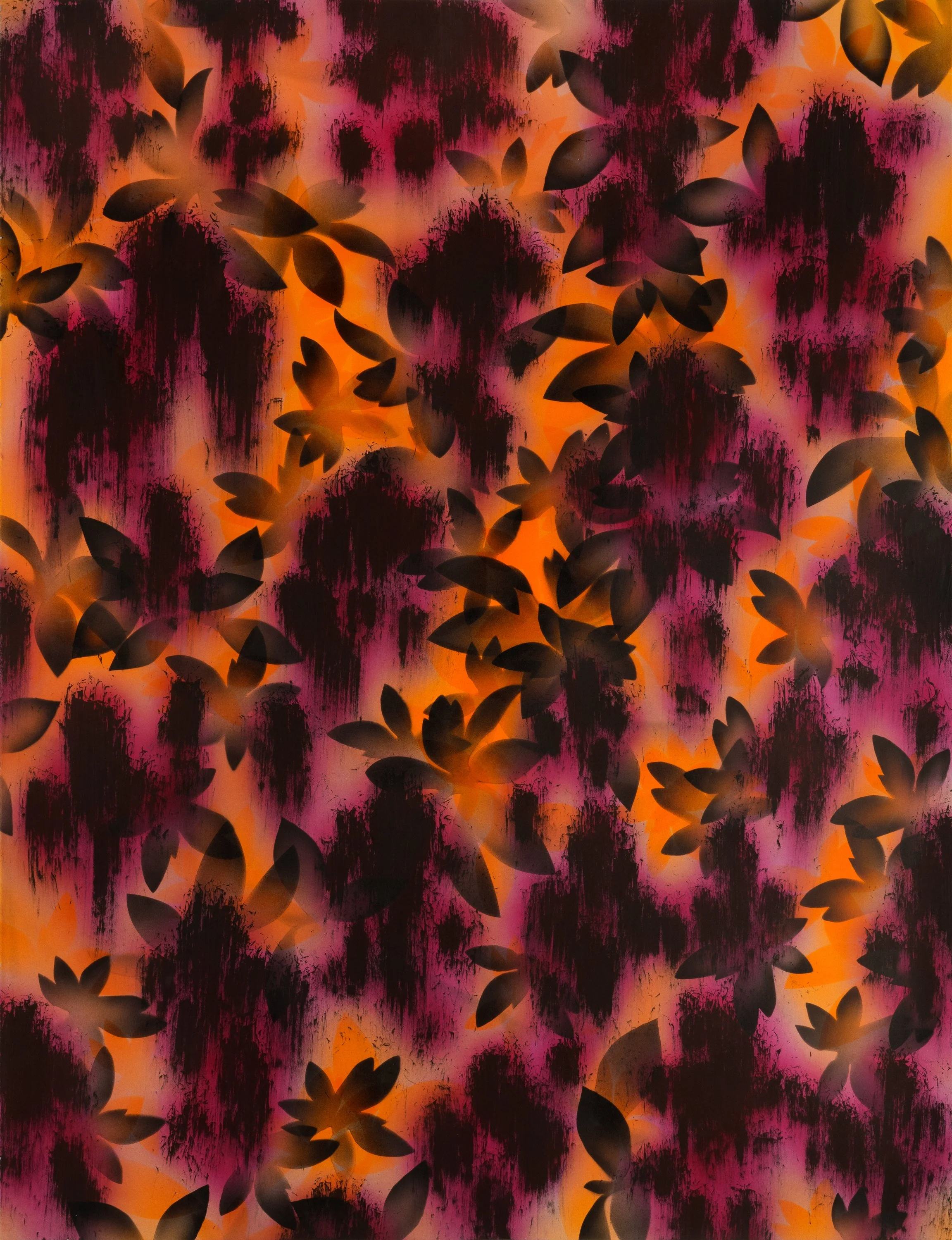 Dusk, created in 2022 as a stage backdrop for the Bank of America Chamber Music series at Spoleto Festival USA, was installed at the Dock Street Theatre in Charleston and continues to serve as the backdrop for chamber music performances through the 2026 season. The original painting on paper (50 x 38 in.) began with a layer of painted Spanish moss, followed by a layer of azalea leaves. Finally, a dense layer of airbrushed reds, oranges, and magentas fused the composition into a dusk-like landscape. The final backdrop was created by digitally mirroring the original painting multiple times, transforming the shapes into a larger, symmetrical, patterned structure that suggests a dense forest—magical and mysterious, with an almost ghostly presence that envelopes the performers.