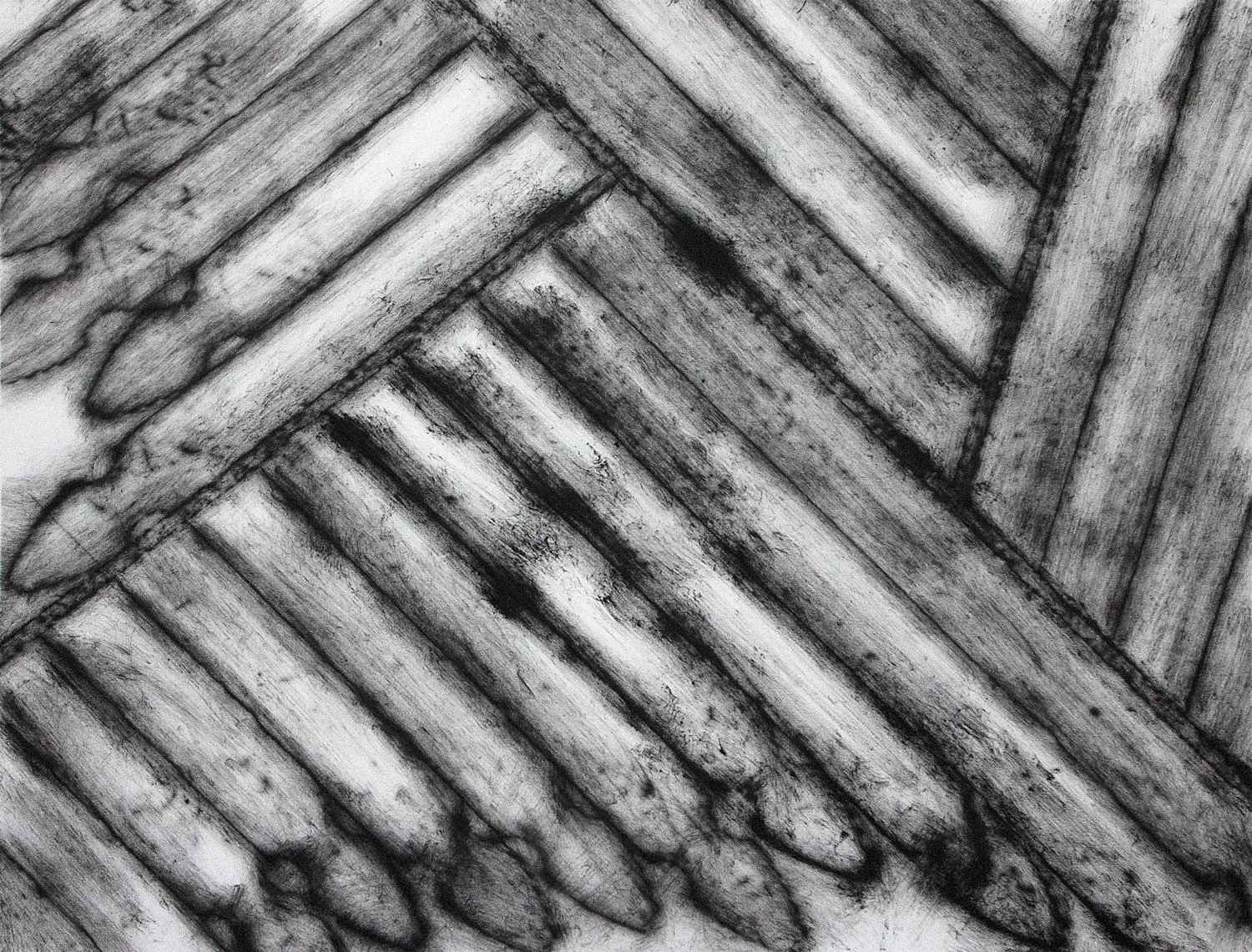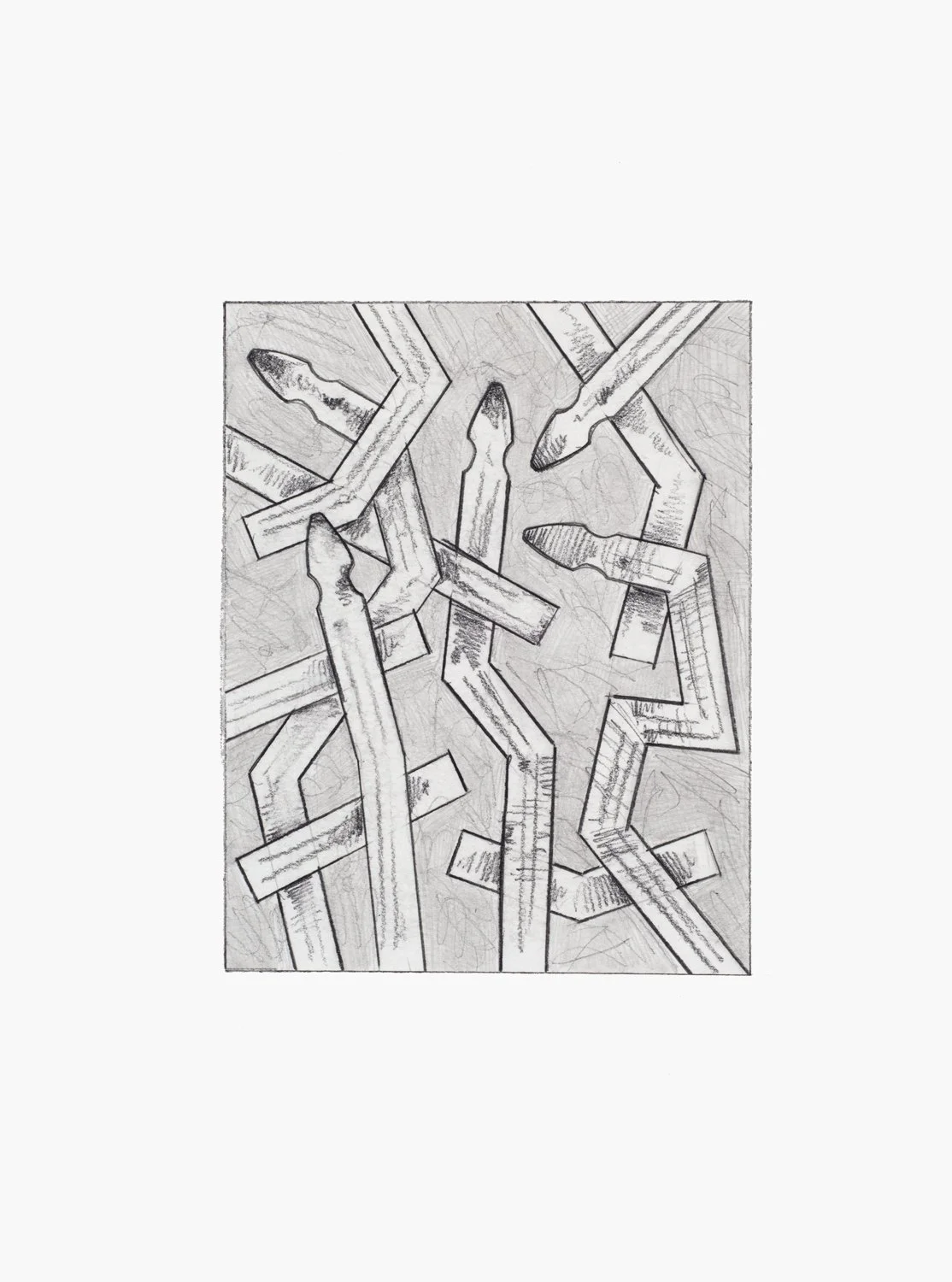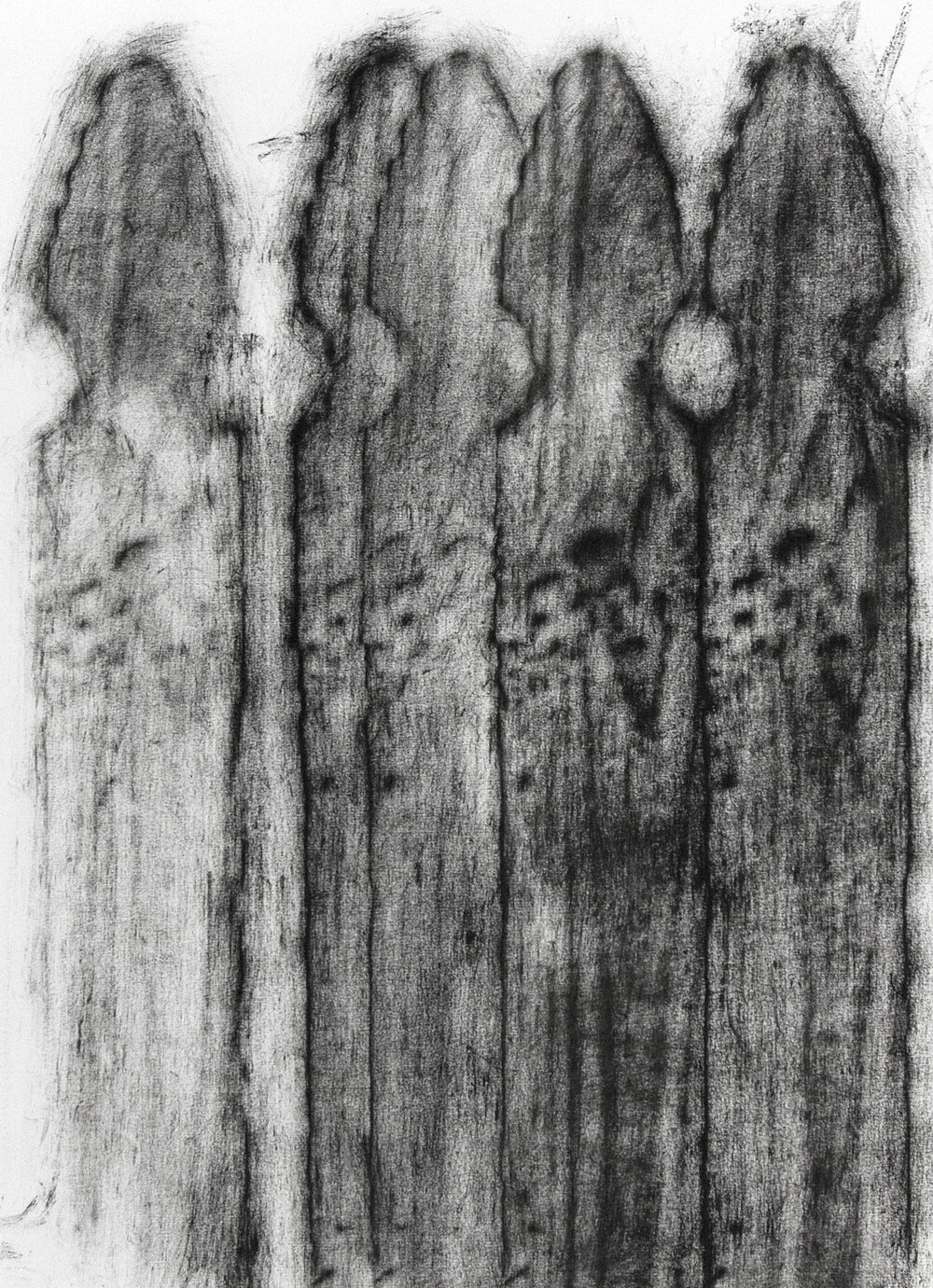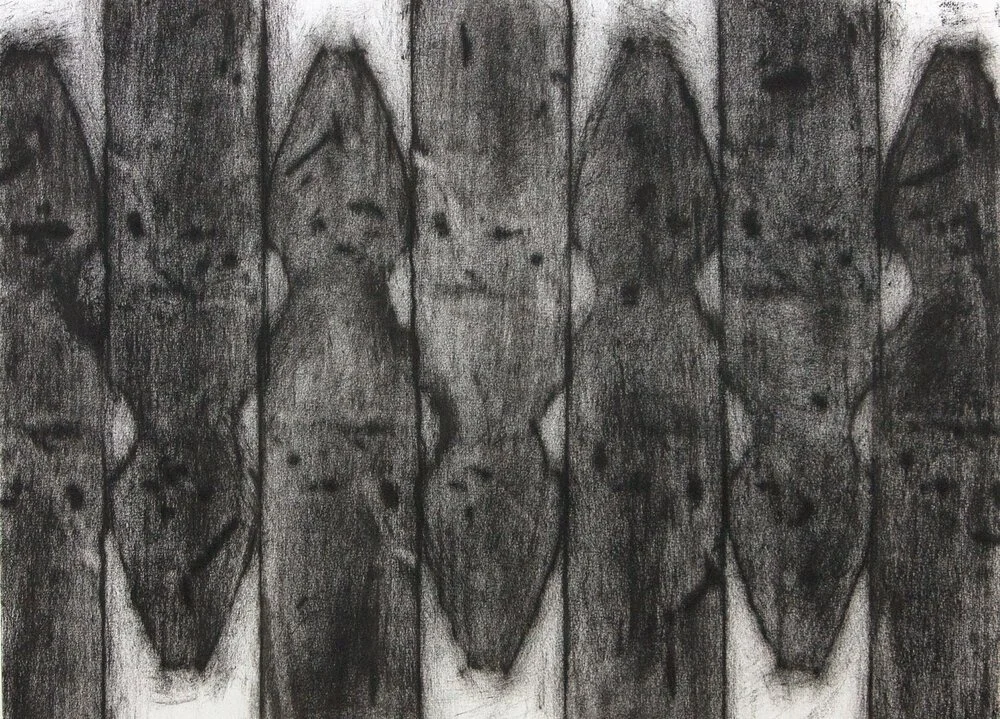 The exhibition brings together studies ranging from small-scale drawings in colored pencil, ink, and pigment to larger, more complex compositions rendered in acrylic. A unique rubbing technique produces delicate, charcoal-like surfaces that emphasize variation, resulting in distinct textures across works made from the same wooden picket.
