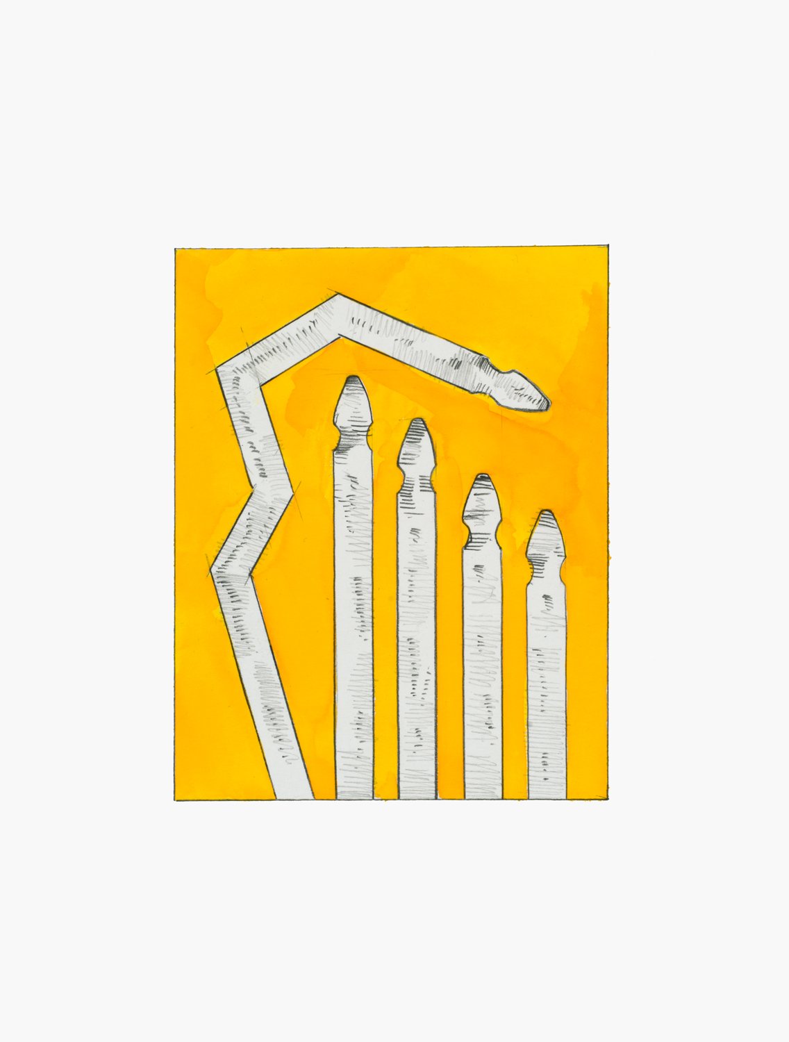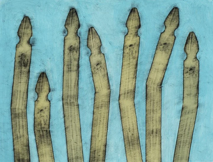 Studio Works, a companion exhibition to Promiseland (2020), presents a series of works on paper incorporating picket fence posts.